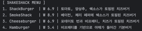 MenuItem menuItem1 = new MenuItem("ShackBurger", 6.9, "토마토, 양상추, 쉑소스가 토핑된 치즈버거");
