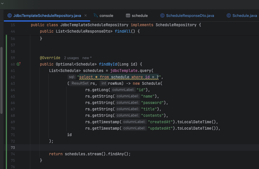 schedule은 scheduleRepository.findById(id)를 통해 데이터를 가져오는데 그렇다면 해당 코드에 문제가 있을 것으로 생각함