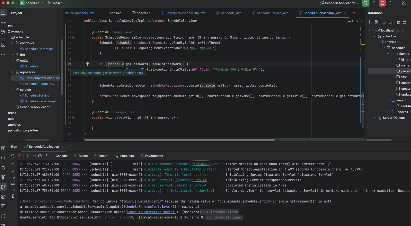 rs.getString("password")를 추가하여 schedule.getPassword()가 정상적으로 작동함